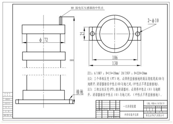 6、串接于交流6~35KV非有效接地系統PT一次繞組中性點與地之間,在一個系統中接有多臺電壓互感器時,應每臺互感器的三相高壓繞阻中性點裝一臺消諧器, 才能有效地限制弧光接地過電壓和消除鐵磁諧振。